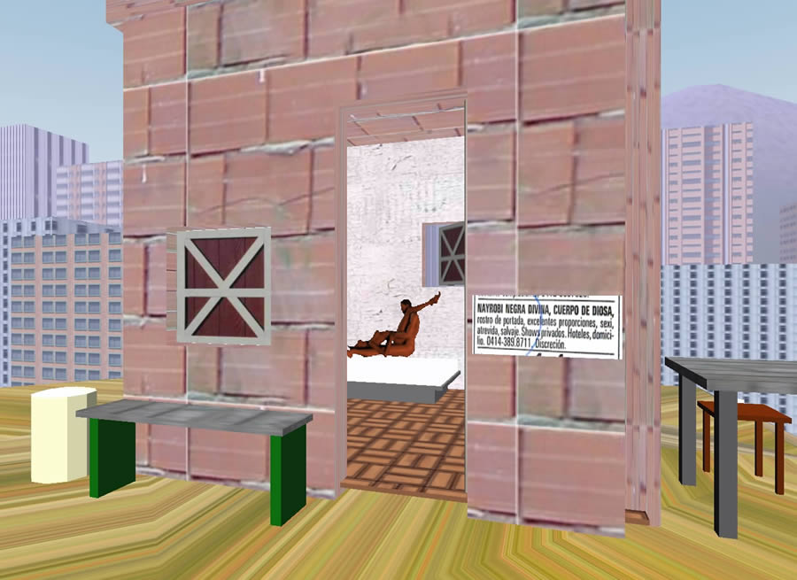 City Rooms is a virtual world which involves the viewer gradually, done to be observed and enjoyed through the Internet, and which presents the opportunity to participate and interact with the spaces I have fractally explored in my work. A house-universe protects behind naked walls the intimacy of the habitat, submerged in a unique and homologating urban space. The observer has autonomy in choosing a tour of the digital work. By transposing a door, pulling a curtain, by opening a window, he/ she can go into the rooms, discovering in each the characters that dwell in them and keep them warm, even in contradiction and conflict. They will have access to the furniture and personal belongings of its owners. The visitor freely explores these elements, using the aesthetics of video-games to wander through the spaces of a city-house that goes on becoming more and more personal. The path through the art piece allows for the exploration of the urban spaces common to each room, the leveled out city that houses and obliges, the swarm on the streets. Only the return to the intimacy of spaces leads to another kind of experience. By being able to "navigate" through the rooms, the spectator becomes an integral part of the proposal. He can go through and snoop around the objects in a drawer or on a night table. Eventually, he runs into the intimacy of the house-heart, the one that repeats itself in the lives of everyone: social-political behaviors, nakedness, sex, religious beliefs, memories; allowing, together with a moment of intromission into that last and irreducible refuge of the soul, house and city; a transportation into a timeless instant, when that house becomes one's own, every room carving and defining the spaces that make us up: a fraction in the wholeness of man, an universe in the heart of the same man. A Reality that agitates within us today.